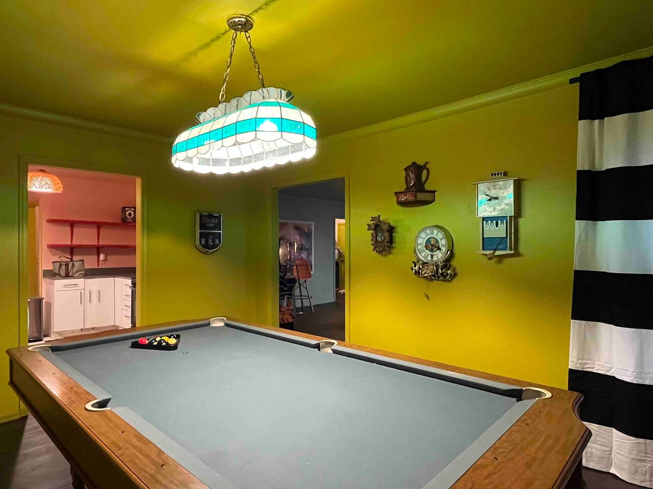 This is a 3 bed, 2 bath home with 2 large living spaces. The house has a hot tub, pool table, arcade games, firepit, and sleeps 10. The backyard is fully fenced-in for dogs!