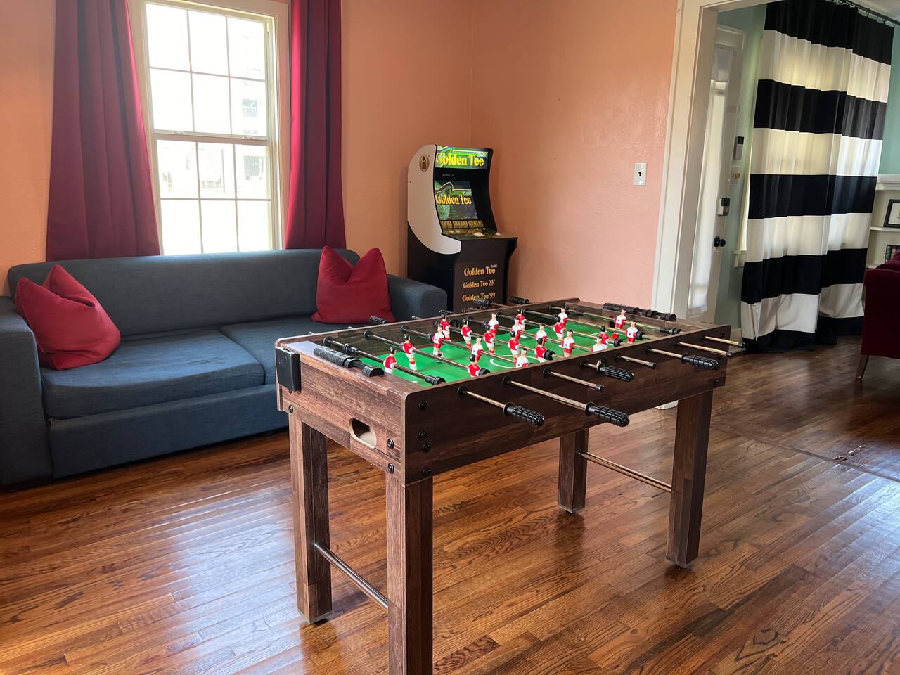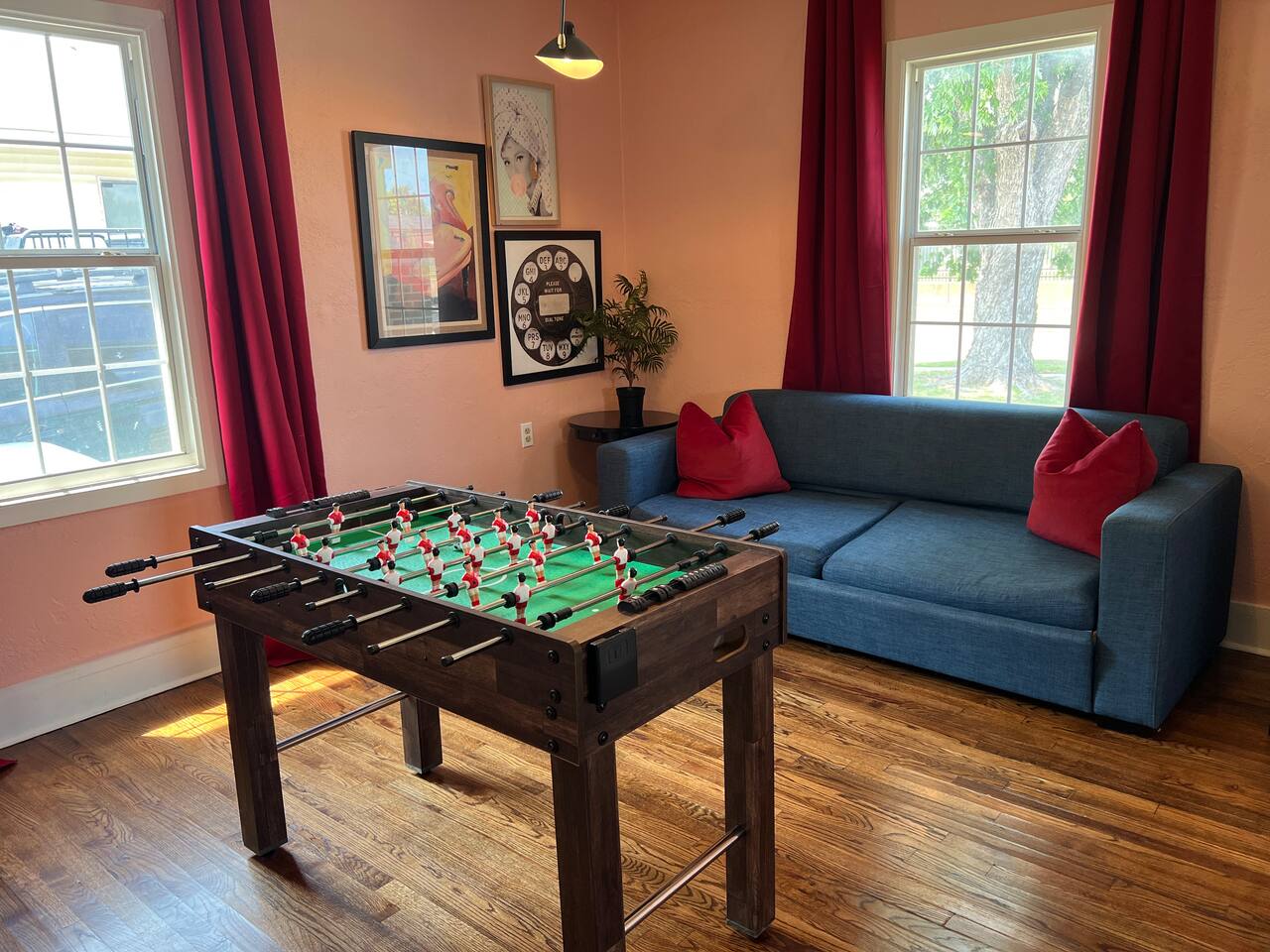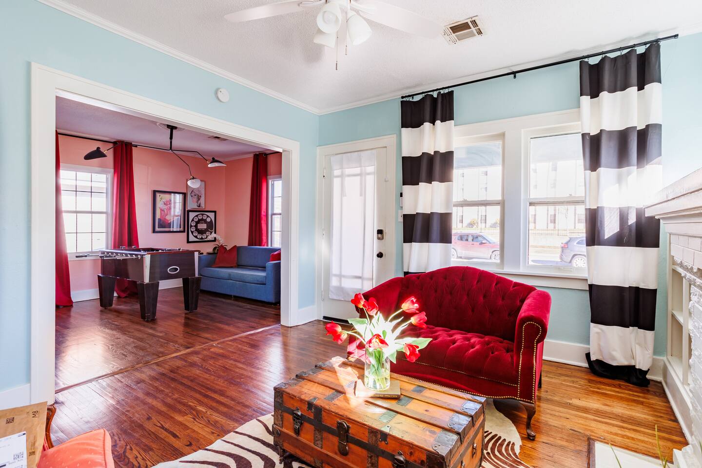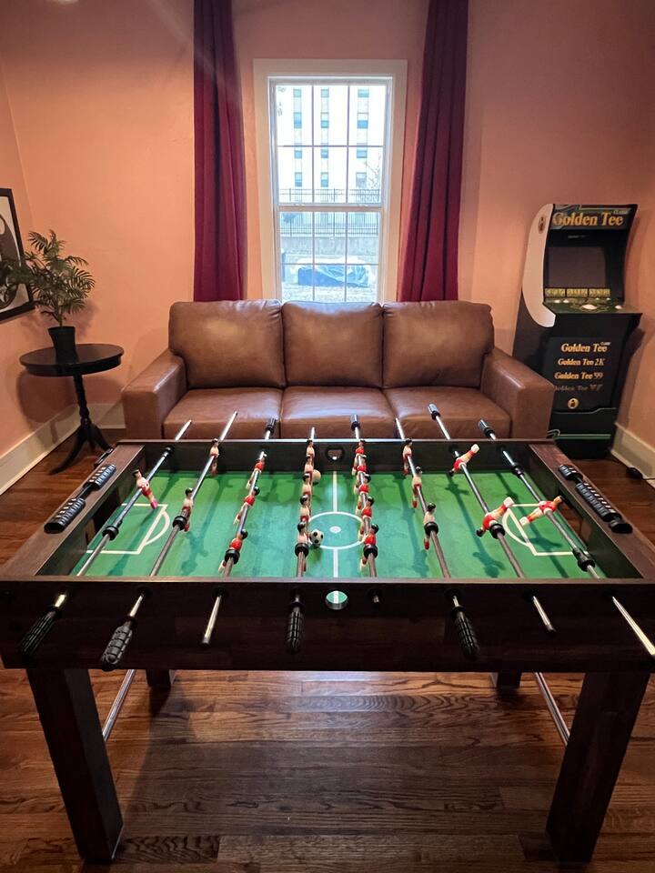 It is a 2 bedroom, 1 bath. There is also a bonus living space with a pull-out couch. The house sleeps 2 in the king bed in the primary bedroom, 3 in the back bedroom (full with twin bunk), 2 in the front bonus living space pull-out couch, and 1 in a rollaway twin bed. We also have a 66 airstream in the backyard that sleeps an additional 2 people. In the bonus living room, there is a foosball table! The house also comes with a cool outdoor space equipped with a solo stove wood burning fireplace and outdoor cooking grill. There is a washer/ dryer on site. The property is located in an up-and-coming area that is very close to OU medical and downtown/ capital area.