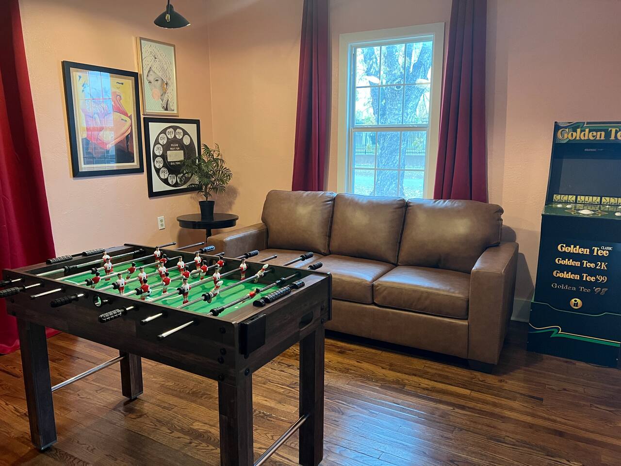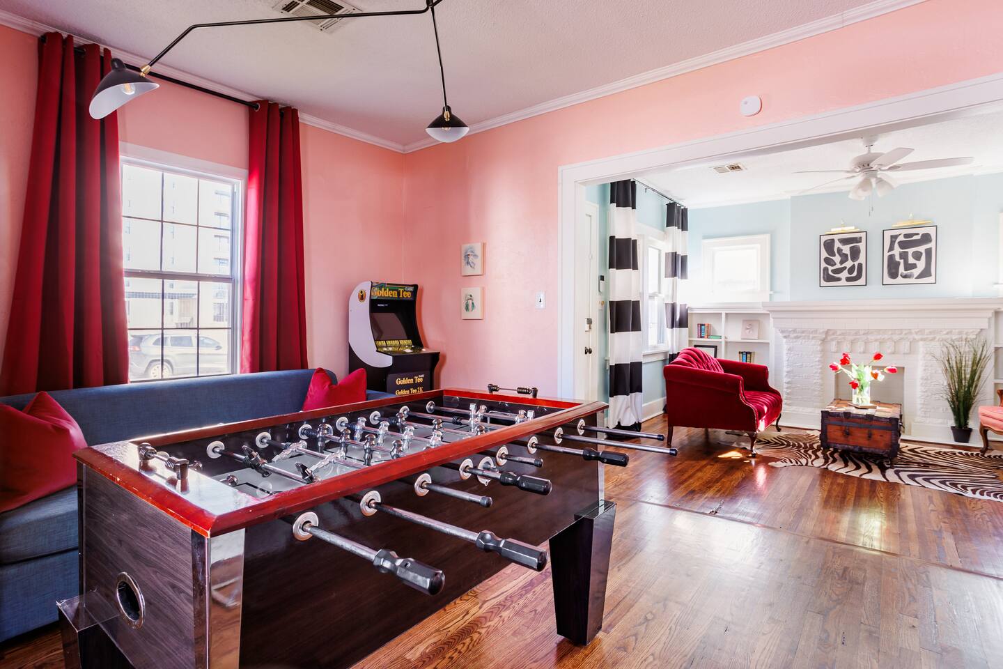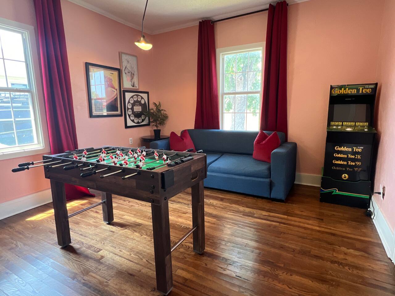 It is a 2 bedroom, 1 bath. There is also a bonus living space with a pull-out couch. The house sleeps 2 in the king bed in the primary bedroom, 3 in the back bedroom (full with twin bunk), 2 in the front bonus living space pull-out couch, and 1 in a rollaway twin bed. We also have a 66 airstream in the backyard that sleeps an additional 2 people. In the bonus living room, there is a foosball table! The house also comes with a cool outdoor space equipped with a solo stove wood burning fireplace and outdoor cooking grill. There is a washer/ dryer on site. The property is located in an up-and-coming area that is very close to OU medical and downtown/ capital area.