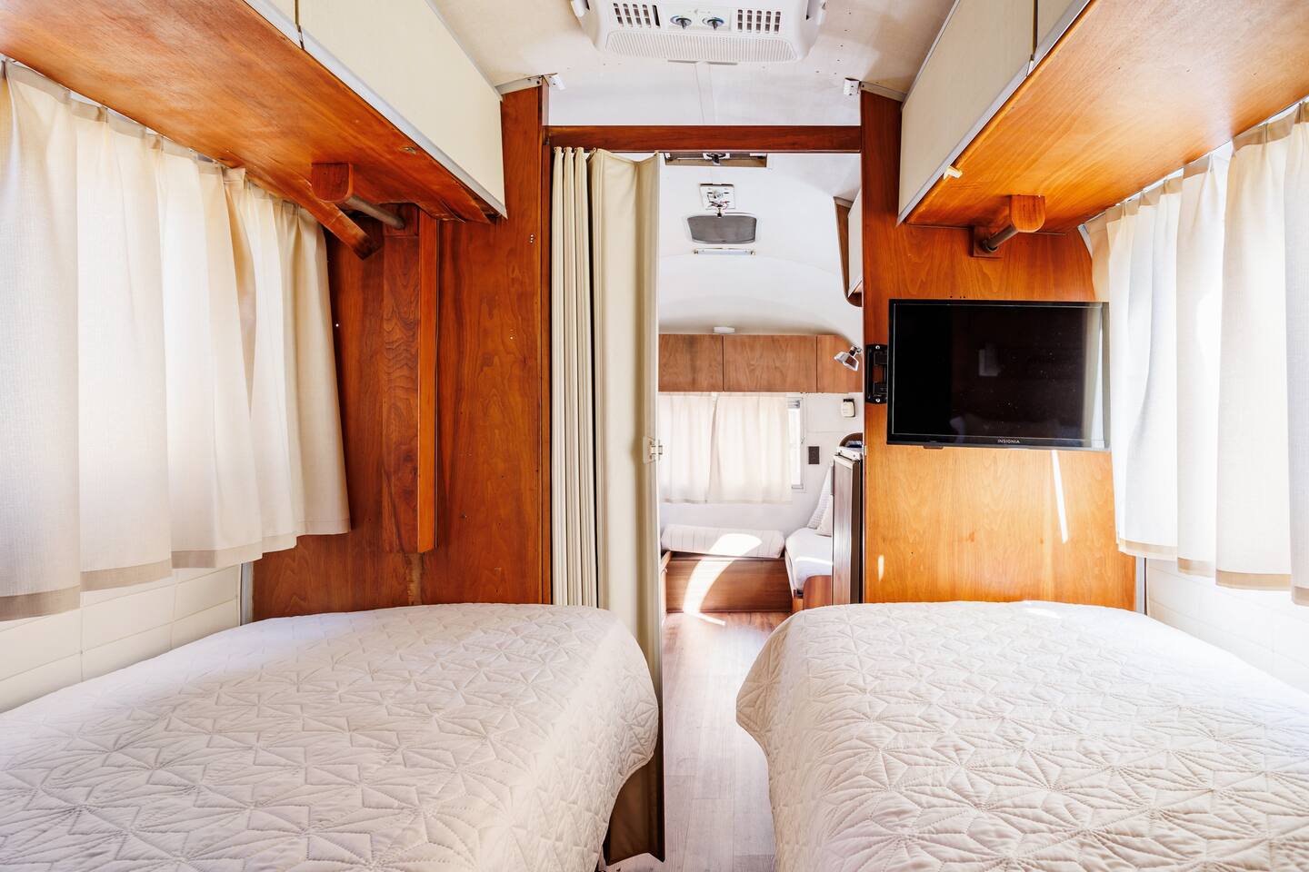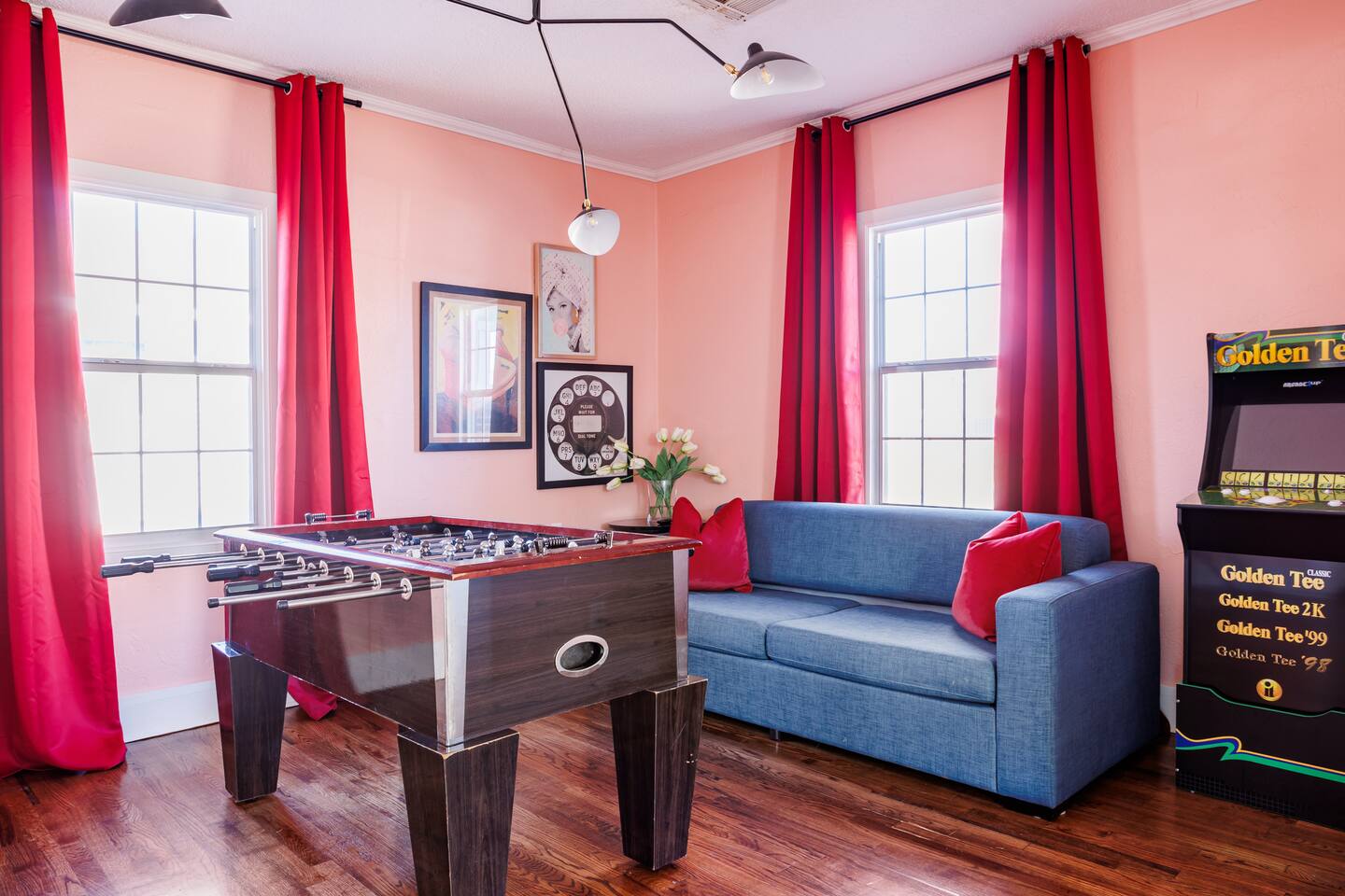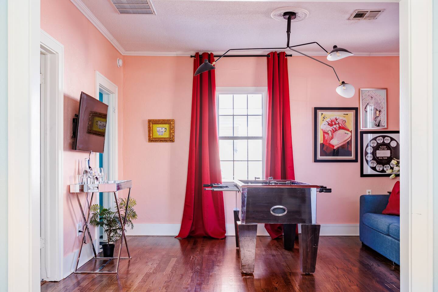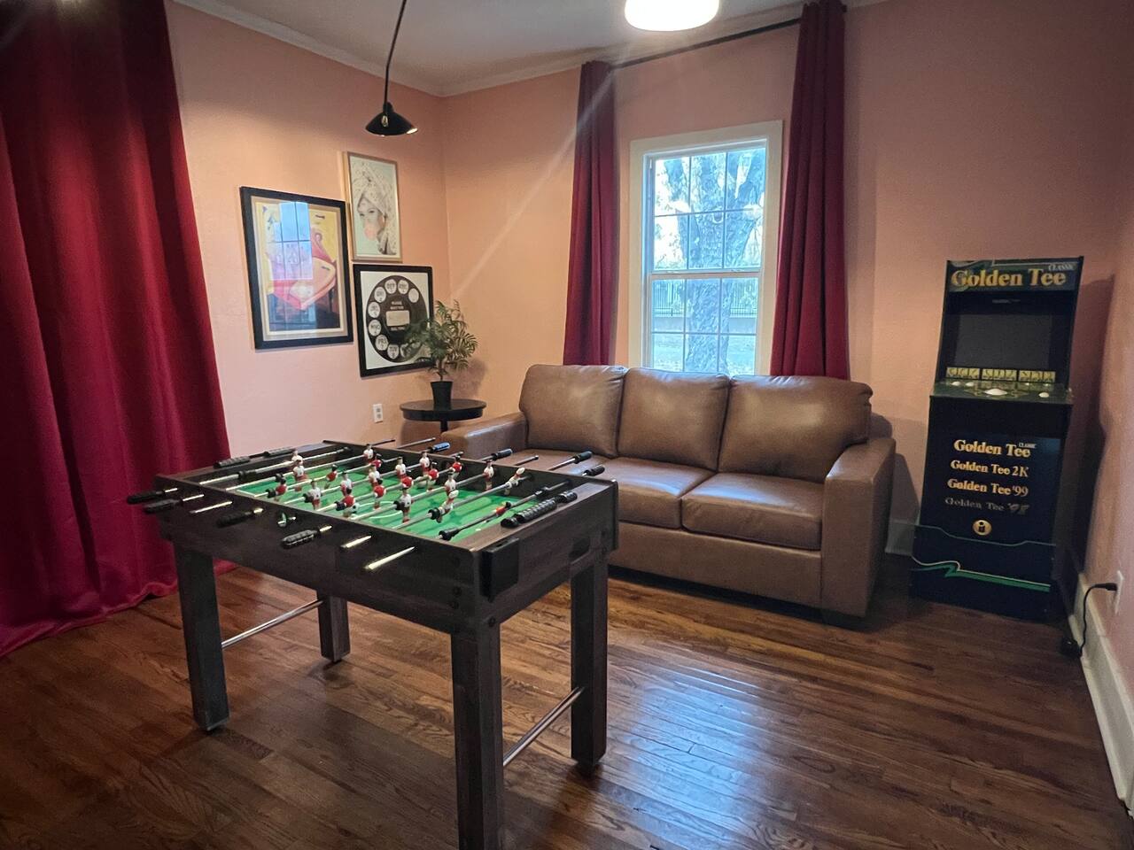 It is a 2 bedroom, 1 bath. There is also a bonus living space with a pull-out couch. The house sleeps 2 in the king bed in the primary bedroom, 3 in the back bedroom (full with twin bunk), 2 in the front bonus living space pull-out couch, and 1 in a rollaway twin bed. We also have a 66 airstream in the backyard that sleeps an additional 2 people. In the bonus living room, there is a foosball table! The house also comes with a cool outdoor space equipped with a solo stove wood burning fireplace and outdoor cooking grill. There is a washer/ dryer on site. The property is located in an up-and-coming area that is very close to OU medical and downtown/ capital area.