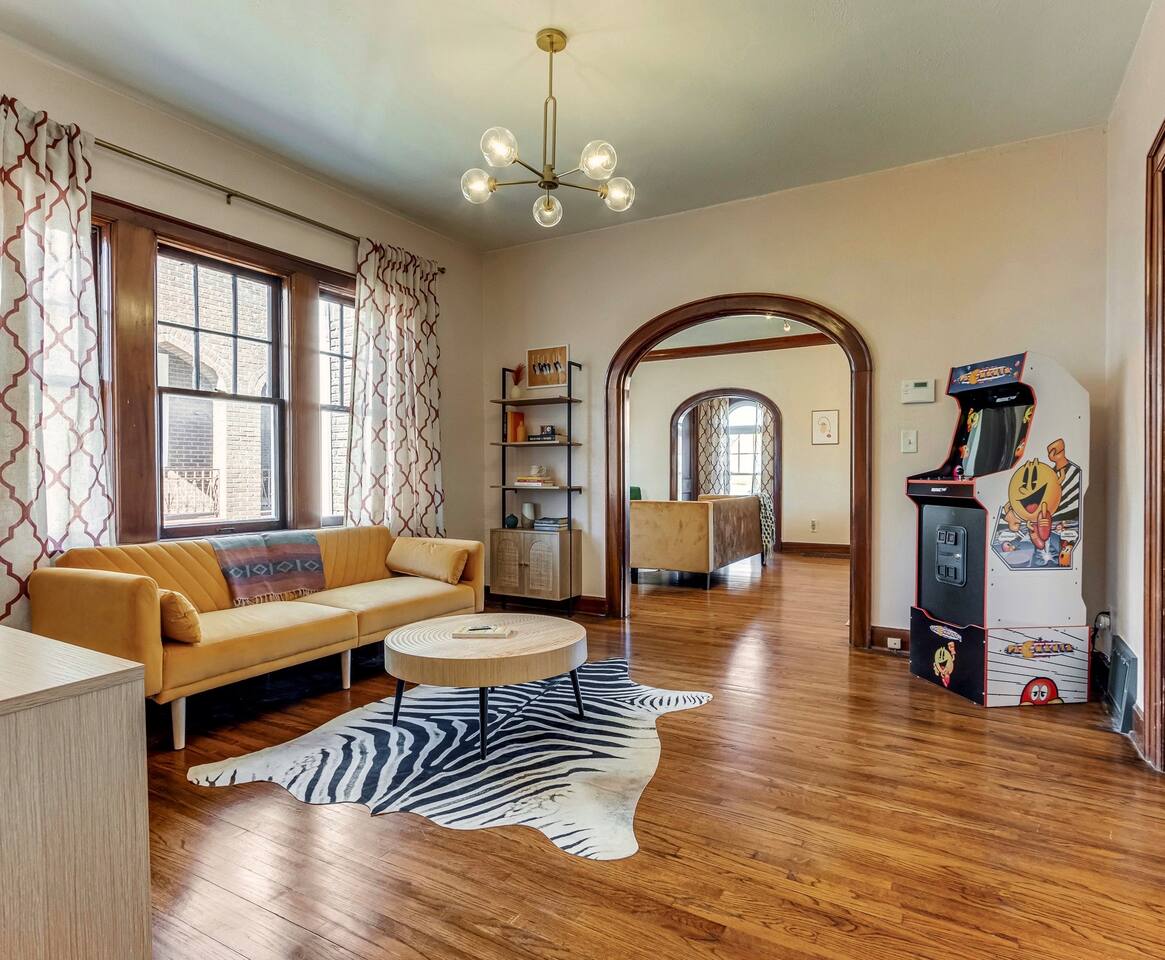 This is a 2 bedroom, 1 bathroom home with 2 large living spaces. The house has a full-size arcade machine, books, and roku smart TVs. The backyard is fully fenced in for pets!