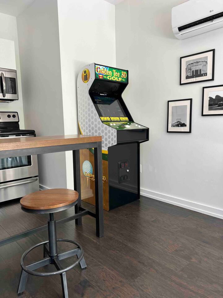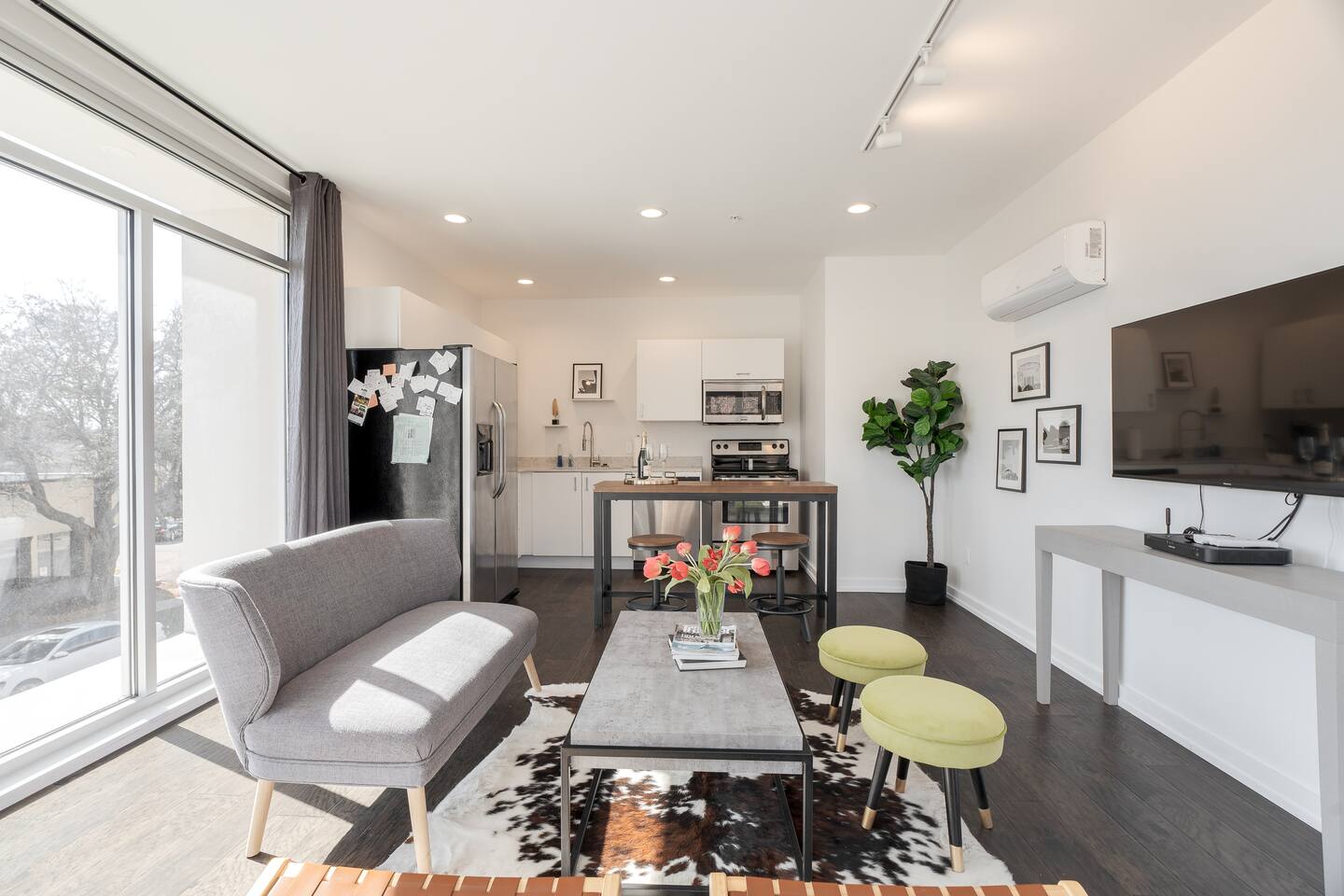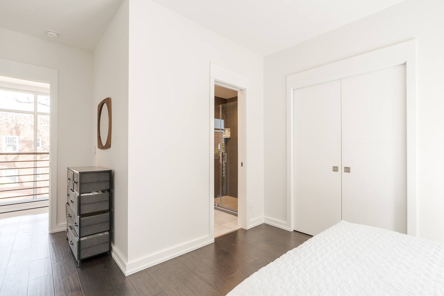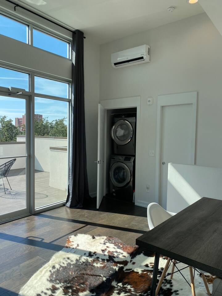 You will have private access to all 3 levels of this modern condo. When you enter on the ground level, you'll take a flight of stairs up to the main level where there’s a full kitchen, living area, balcony, full bathroom w/shower, and small private bedroom with full sized bed. Another set of stairs will take you to the open concept primary suite with a large balcony, work space, king bed, half bath, and washer & dryer. There are large smart TVs in the living area and primary suite. Unit E: https://airbnb.com/h/downtownmoderncondounite Unit B: airbnb.com/h/therowunitb Unit E & B Combo Listing: airbnb.com/h/eandb